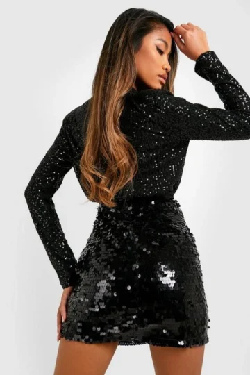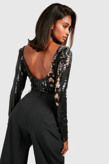 BOOHOO Black Demask Sequin Backless Bodysuit