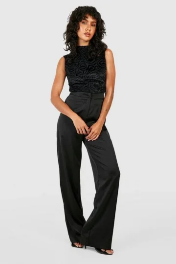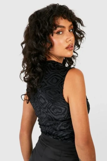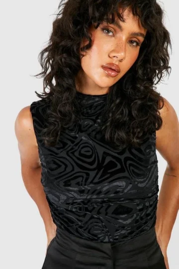 BOOHOO Burnout Velour Abstract Ruched High Neck Top