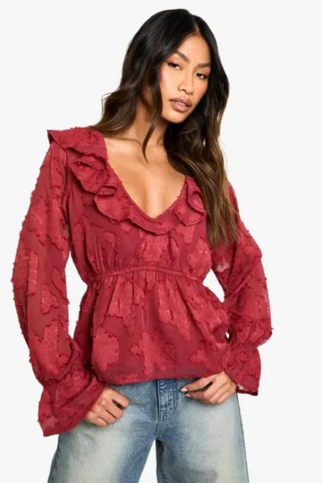 BOOHOO Burnout Floral Ruffle Neck And Cuff Blouse