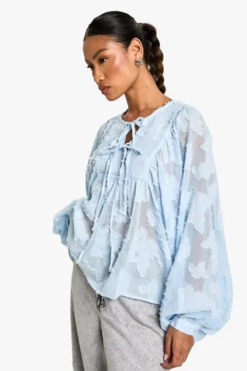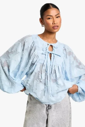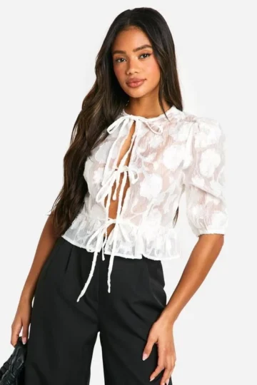 BOOHOO Burnout Puff Sleeve Tie Front Blouse