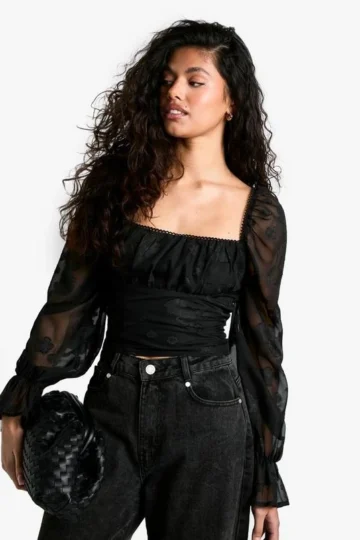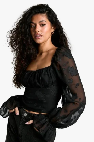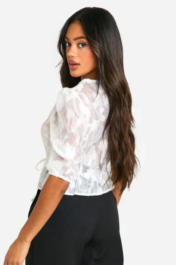 BOOHOO Burnout Floral Tie Front Puff Sleeve Smock Top