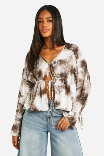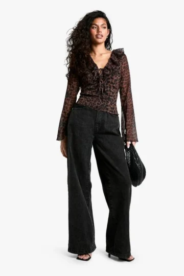 BOOHOO Chiffon Leopard Ruffle Tie Front Blouse