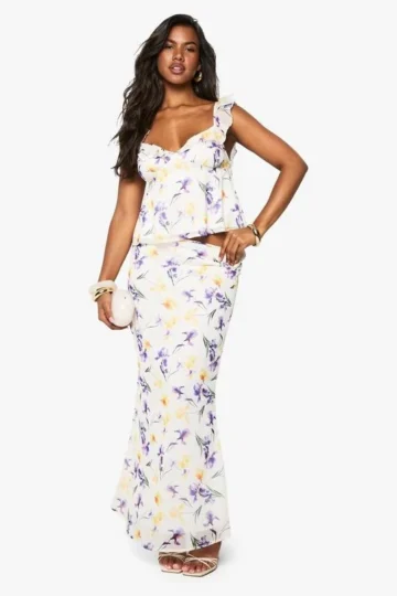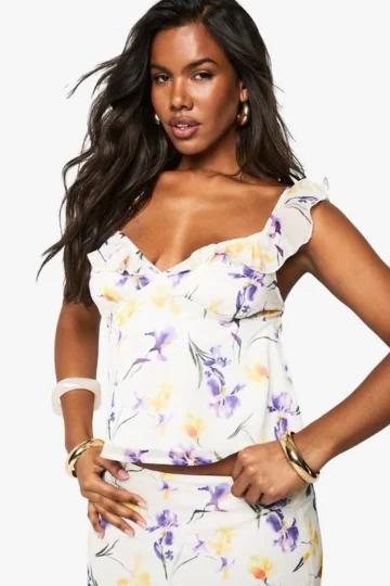 BOOHOO Chiffon Floral Print Ruffle Strap Cami Top