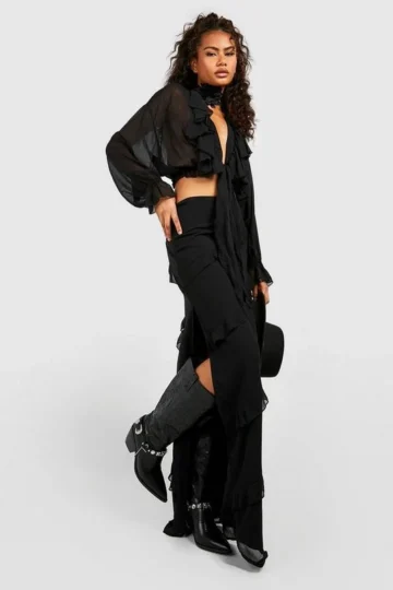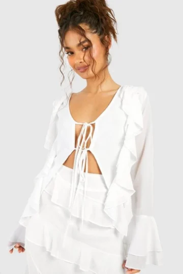 BOOHOO Chiffon Ruffle Tie Detail Frill Hem Blouse Top