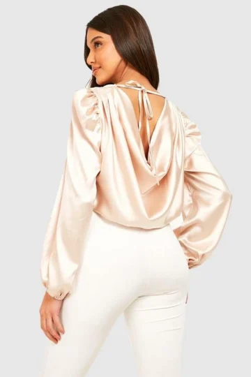 BOOHOO Cowl Front Puff Sleeve Satin Top