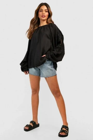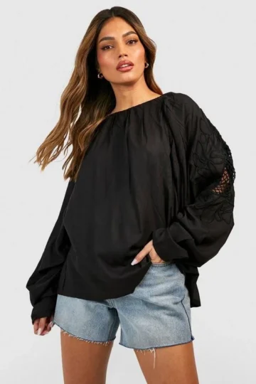 BOOHOO Cut Out Embroidered Balloon Sleeve Blouse