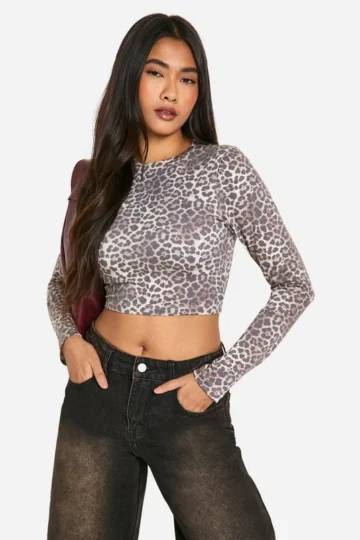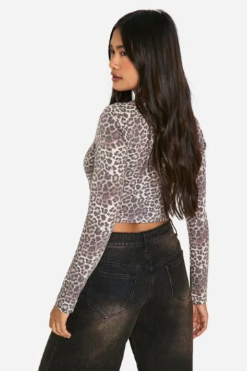 BOOHOO Basic Animal Print Cotton Long Sleeve Asymmetric Top