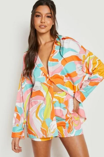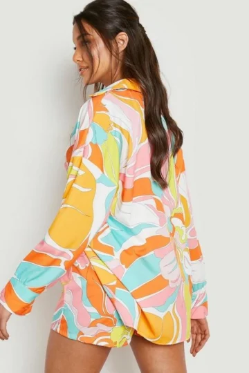 BOOHOO Abstract Floral Print Tie Front Shirt & Shorts