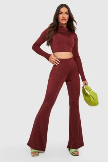 BOOHOO Acetate Slinky High Neck Crop & Flare Pants