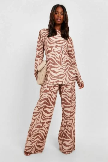 BOOHOO Zebra Print Plisse Wide Leg Pants