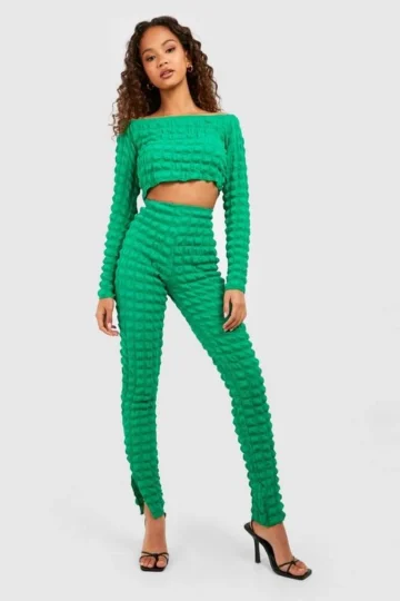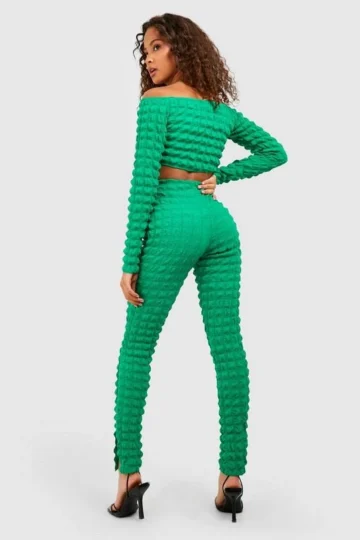 BOOHOO Bubble Jersey Knit Off The Shoulder Crop & Split Hem Pants