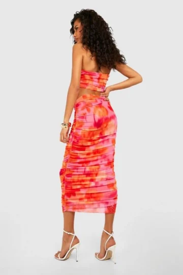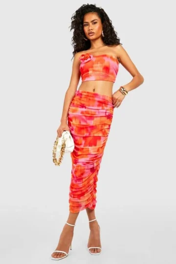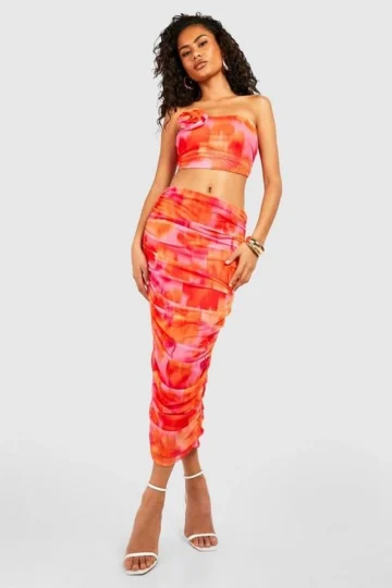 BOOHOO Blurred Floral Ruched Mesh Corsage Top & Midi Skirt