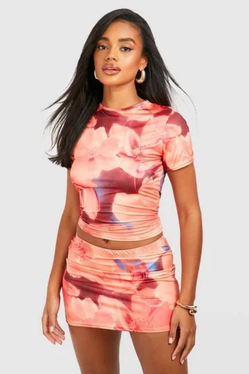 BOOHOO Blurred Floral T-shirt & Mid Rise Mini Skirt