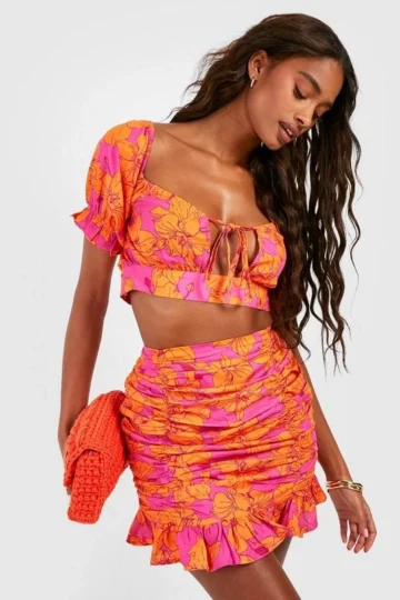 BOOHOO Floral Puff Sleeve Crop & Ruched Mini Skirt