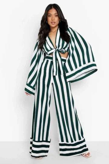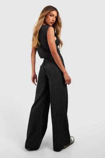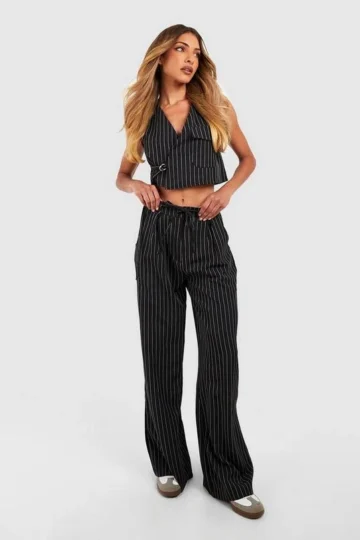BOOHOO Pinstripe Tie Waist Tailored Wide Leg Trousers
