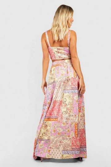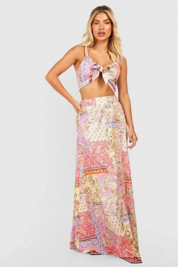 BOOHOO Paisley Print Knot Bralette & Thigh Split Maxi Skirt