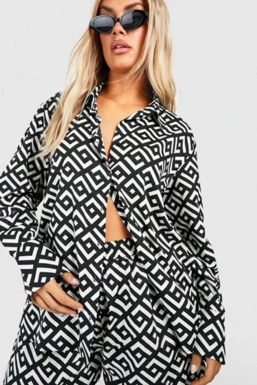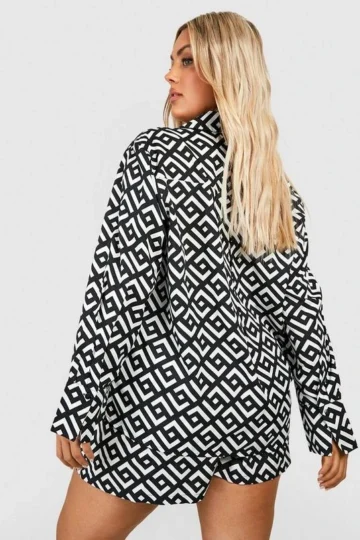 BOOHOO Plus Mono Geo Print Shirt & Shorts Two-Piece Set